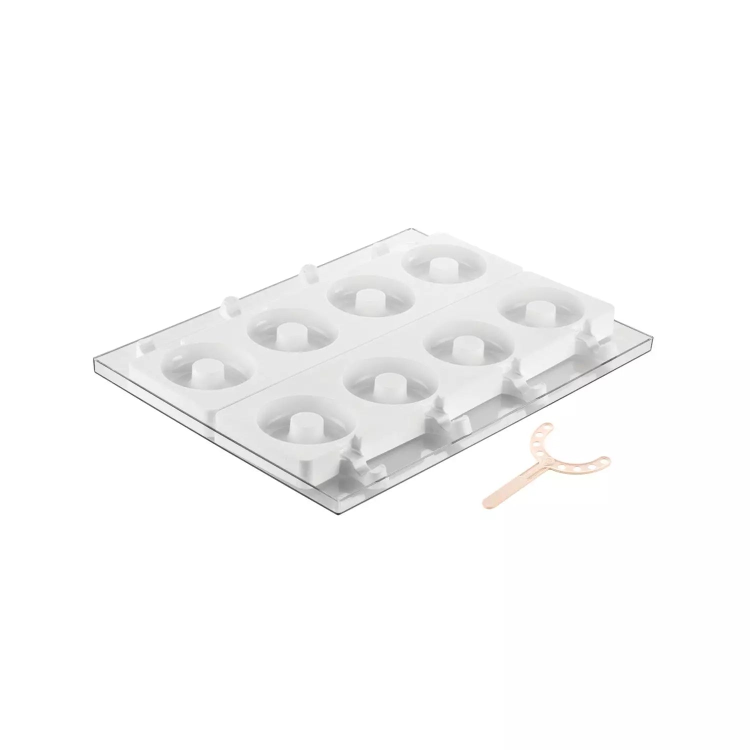 GEL13 Donuts gelato on stick will surprise you delighting sight and taste. Practical and funny made of 100% food-grade silicone, it is presented in a 2 pcs kit within sticks and a transparent tray, suitable for the preparation and the display of the product. GEL13 Donuts mould is composed of 4 cavities of 86 ml each and a specific hole for the stick.