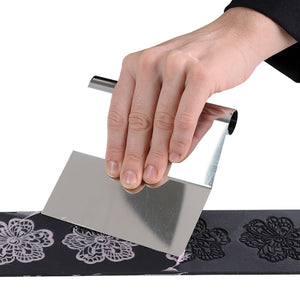 Stainless steel scraper with plastic handle to work chocolate.
